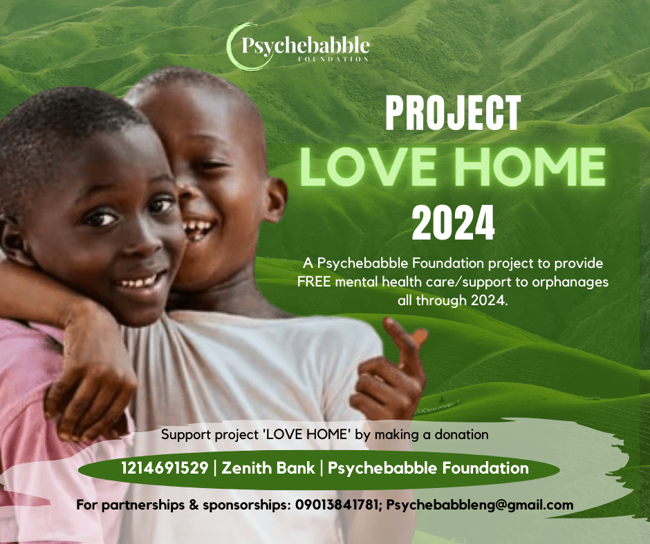 Psychebabble Foundation’s project LOVE HOME aims to provide and strengthen mental health care at an orphanage in Lagos State all through 2024. Psychebabble will be providing FREE mental health care & psychosocial support through psycho-education, life skill trainings, psychotherapy sessions, assessments such as learning disability assessments to orphanages all through 2024 with a robust curriculum.