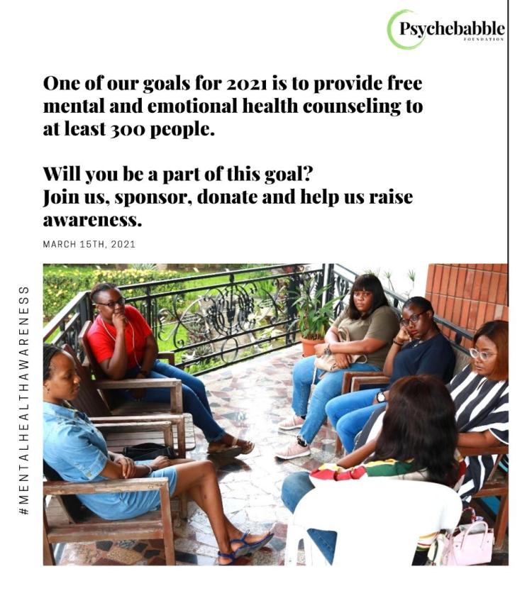 Psychebabble Foundation’s free mental health first aid & counseling is one of our major projects. This aims to make mental health care accessible to every Nigerian (both home and away) from the comfort of their home.